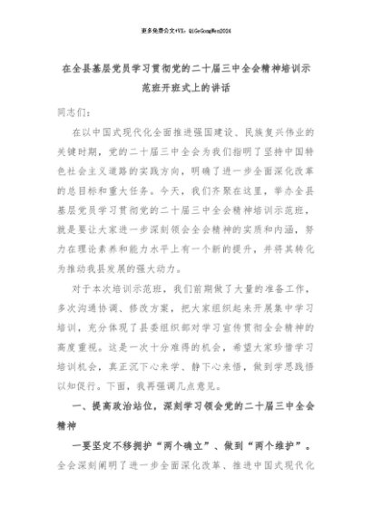 【七哥公文】2024年:在全县基层党员学习贯彻党的二十届三中全会精神培训示范班开班式上的讲话+更多免费公文+VX:QiGeGongWen2024