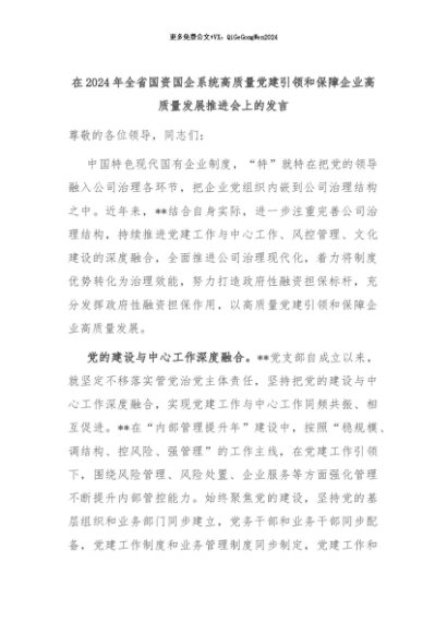 【七哥公文】2024年:在2024年全省国资国企系统高质量党建引领和保障企业高质量发展推进会上的发言+更多免费公文+VX:QiGeGongWen2024