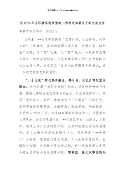 【七哥公文】2024年:在2024年全区楼宇商圈党建工作推进部署会上的交流发言+更多免费公文+VX:QiGeGongWen2024
