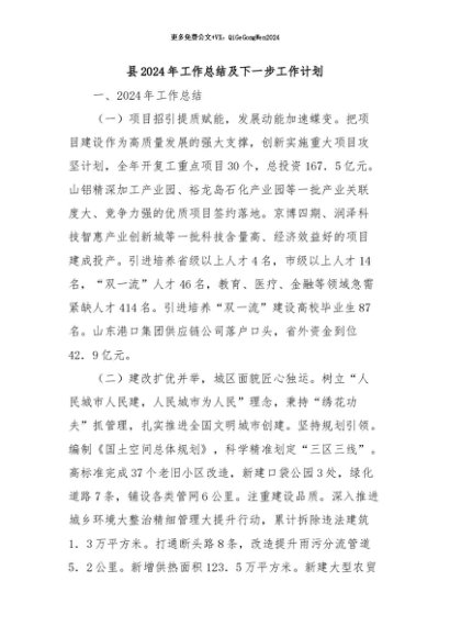 / 【七哥公文】2024年:县2024年工作总结及下一步工作计划+更多免费公文+VX:QiGeGongWen2024