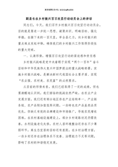 / 【七哥公文】2024年:副县长在乡村振兴百日攻坚行动动员会上的讲话+更多免费公文+VX:QiGeGongWen2024