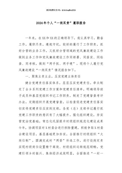/ 【七哥公文】2024年:2024年个人“一岗双责”履职报告+更多免费公文+VX:QiGeGongWen2024