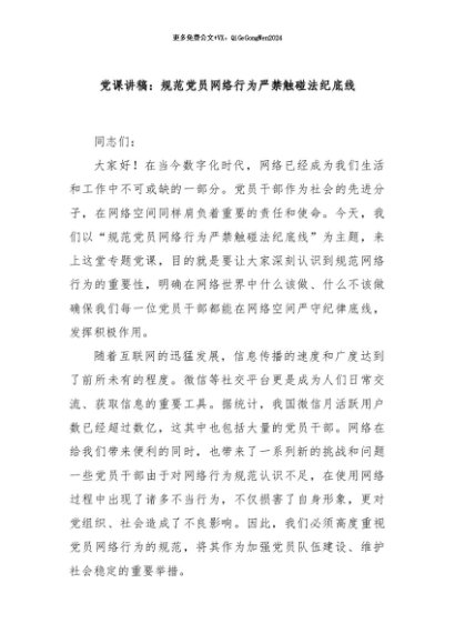 / 【七哥公文】2024年:党课讲稿:规范党员网络行为严禁触碰法纪底线+更多免费公文+VX:QiGeGongWen2024