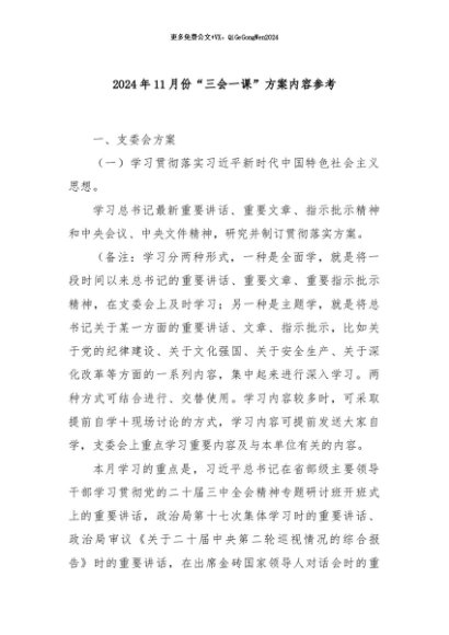 【七哥公文】2024年:2024年11月份“三会一课”方案内容参考 (1)+更多免费公文+VX:QiGeGongWen2024