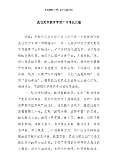 / 【七哥公文】2024年:流动党员教育管理工作情况汇报+更多免费公文+VX:QiGeGongWen2024