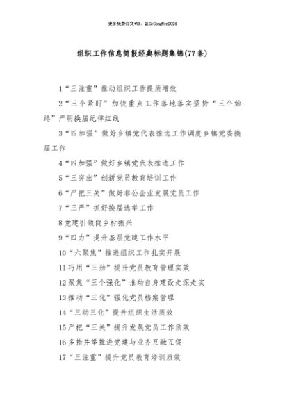 / 【七哥公文】2024年:(77条)组织工作信息简报经典标题集锦+更多免费公文+VX:QiGeGongWen2024
