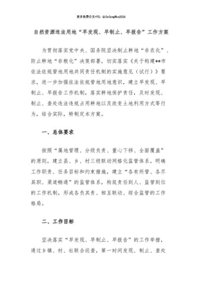 【七哥公文】2024年:自然资源违法用地“早发现、早制止、早报告”工作方案+更多免费公文+VX:QiGeGongWen2024
