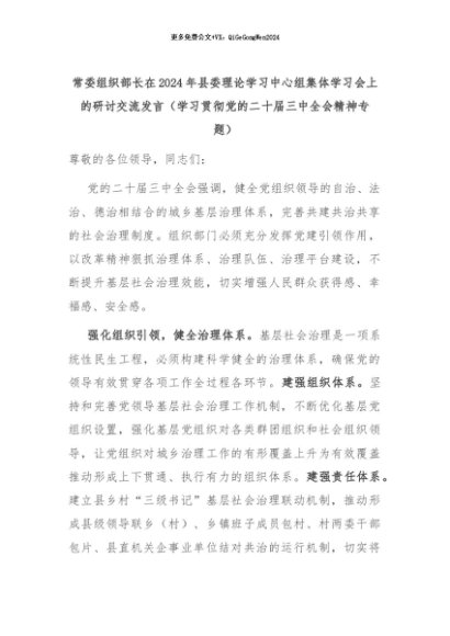 【七哥公文】2024年:常委组织部长在2024年县委理论学习中心组集体学习会上的研讨交流发言(学习贯彻党的二十届三中全会精神专题)+更多免费公文+VX:QiGeGongWen2024
