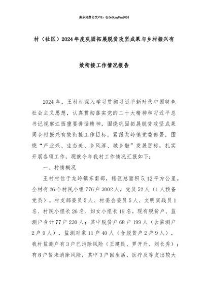 【七哥公文】2024年:村(社区)2024年度巩固拓展脱贫攻坚成果与乡村振兴有效衔接工作情况报告+更多免费公文+VX:QiGeGongWen2024