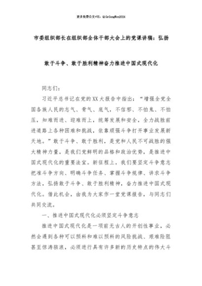【七哥公文】2024年:市委组织部长在组织部全体干部大会上的党课讲稿:弘扬敢于斗争、敢于胜利精神奋力推进中国式现代化+更多免费公文+VX:QiGeGongWen2024