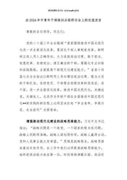 / 【七哥公文】2024年:在2024年中青年干部培训分组研讨会上的交流发言+更多免费公文+VX:QiGeGongWen2024