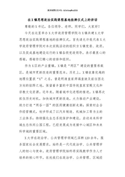 / 【七哥公文】2024年:在X镇思想政治实践课程基地挂牌仪式上的讲话+更多免费公文+VX:QiGeGongWen2024