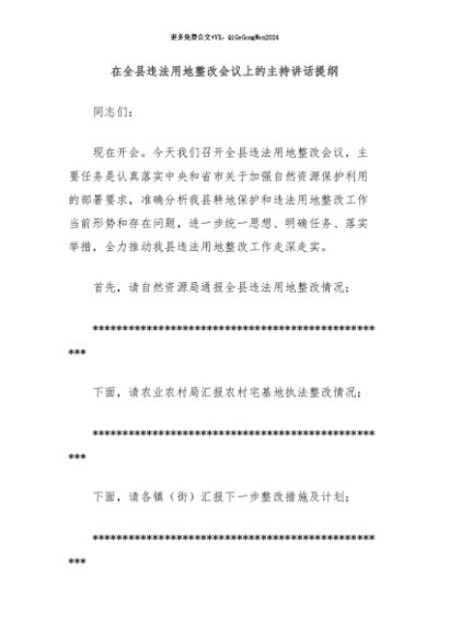 / 【七哥公文】2024年:在全县违法用地整改会议上的主持讲话提纲+更多免费公文+VX:QiGeGongWen2024