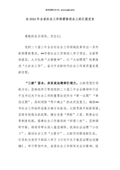 / 【七哥公文】2024年:在2024年全省社会工作部署推进会上的汇报发言+更多免费公文+VX:QiGeGongWen2024