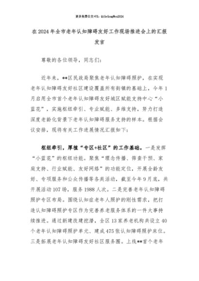 【七哥公文】2024年:在2024年全市老年认知障碍友好工作现场推进会上的汇报发言+更多免费公文+VX:QiGeGongWen2024