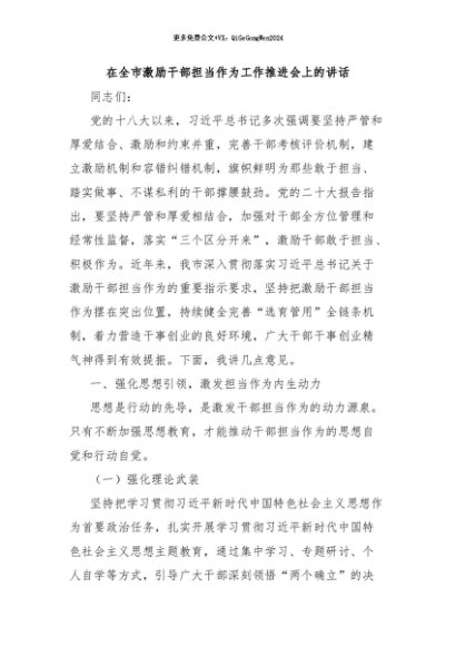 / 【七哥公文】2024年:在全市激励干部担当作为工作推进会上的讲话+更多免费公文+VX:QiGeGongWen2024