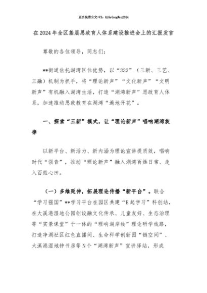 【七哥公文】2024年:在2024年全区基层思政育人体系建设推进会上的汇报发言+更多免费公文+VX:QiGeGongWen2024