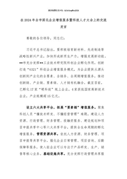 【七哥公文】2024年:在2024年全市深化企业增值服务暨科技人才大会上的交流发言+更多免费公文+VX:QiGeGongWen2024