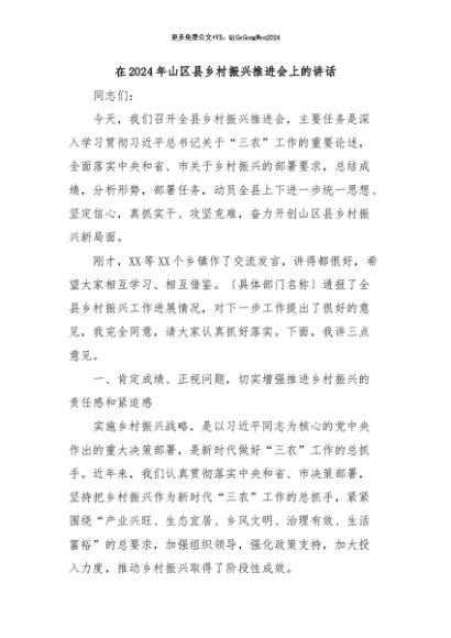 / 【七哥公文】2024年:在2024年山区县乡村振兴推进会上的讲话+更多免费公文+VX:QiGeGongWen2024