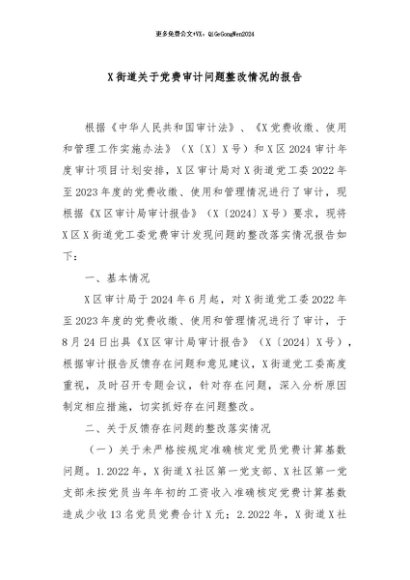 / 【七哥公文】2024年:X街道关于党费审计问题整改情况的报告+更多免费公文+VX:QiGeGongWen2024