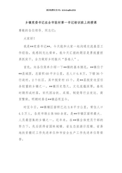 / 【七哥公文】2024年:乡镇党委书记在全市驻村第一书记培训班上的授课+更多免费公文+VX:QiGeGongWen2024