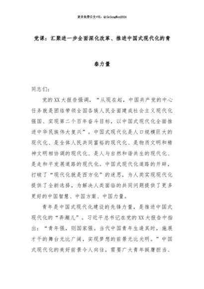 【七哥公文】2024年:党课:汇聚进一步全面深化改革、推进中国式现代化的青春力量+更多免费公文+VX:QiGeGongWen2024