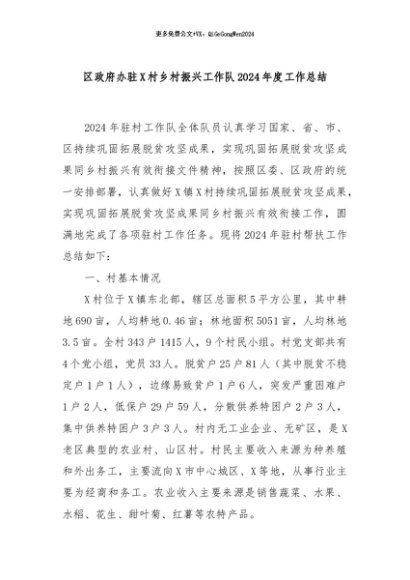 / 【七哥公文】2024年:区政府办驻X村乡村振兴工作队2024年度工作总结+更多免费公文+VX:QiGeGongWen2024