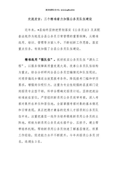 / 【七哥公文】2024年:交流发言:三个精准着力加强公务员队伍建设+更多免费公文+VX:QiGeGongWen2024