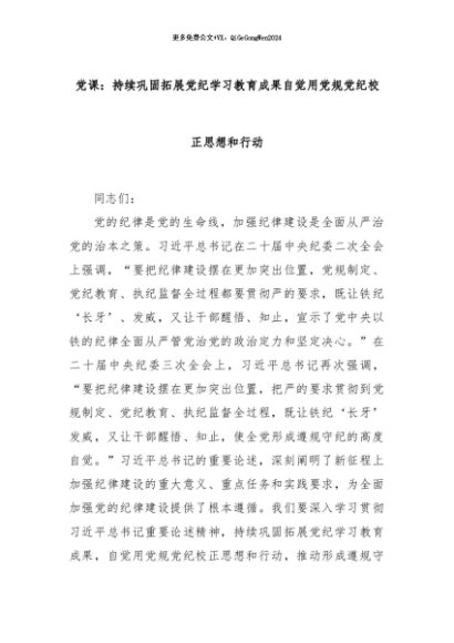 【七哥公文】2024年:党课:持续巩固拓展党纪学习教育成果自觉用党规党纪校正思想和行动+更多免费公文+VX:QiGeGongWen2024