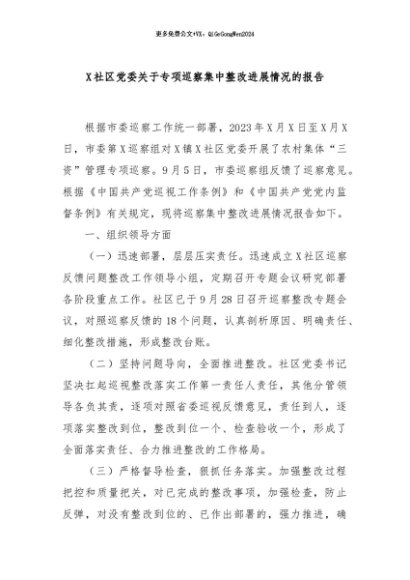 / 【七哥公文】2024年:X社区党委关于专项巡察集中整改进展情况的报告+更多免费公文+VX:QiGeGongWen2024