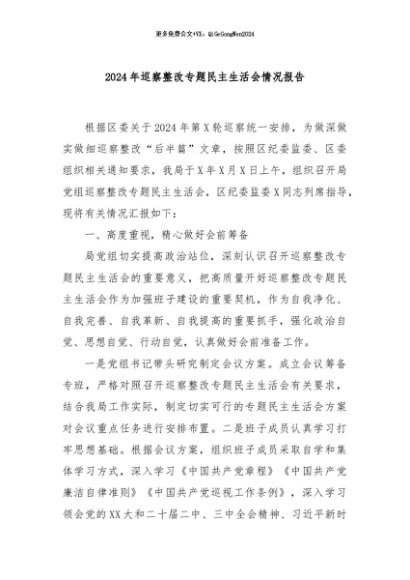 / 【七哥公文】2024年:2024年巡察整改专题民主生活会情况报告+更多免费公文+VX:QiGeGongWen2024