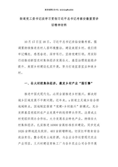 【七哥公文】2024年:街道党工委书记谈学习贯彻习近平总书记考察安徽重要讲话精神材料+更多免费公文+VX:QiGeGongWen2024
