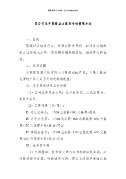 【七哥公文】2024年:某公司业务员提成方案及考核管理办法+更多免费公文+VX:QiGeGongWen2024