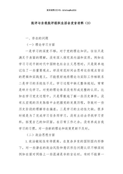 / 【七哥公文】2024年:批评与自我批评组织生活会发言材料(3)+更多免费公文+VX:QiGeGongWen2024