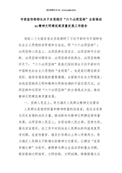 【七哥公文】2024年:市委宣传部部长关于自觉践行“六个必须坚持”全面推动xx精神文明建设高质量发展工作报告+更多免费公文+VX:QiGeGongWen2024