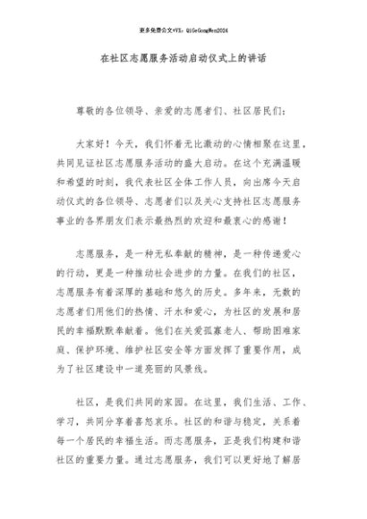 / 【七哥公文】2024年:在社区志愿服务活动启动仪式上的讲话+更多免费公文+VX:QiGeGongWen2024