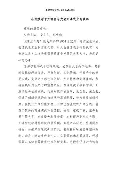 / 【七哥公文】2024年:在开放原子开源生态大会开幕式上的致辞+更多免费公文+VX:QiGeGongWen2024