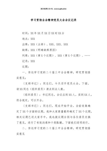 / 【七哥公文】2024年:学习贯彻全会精神党员大会会议记录+更多免费公文+VX:QiGeGongWen2024