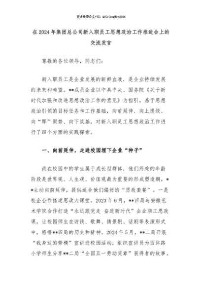 【七哥公文】2024年:在2024年集团总公司新入职员工思想政治工作推进会上的交流发言+更多免费公文+VX:QiGeGongWen2024