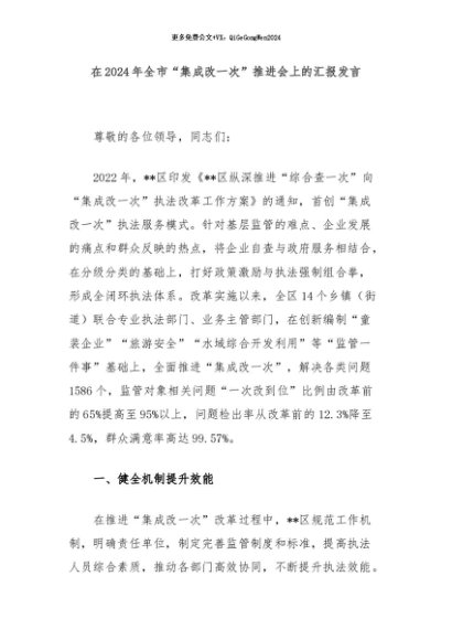 / 【七哥公文】2024年:在2024年全市“集成改一次”推进会上的汇报发言+更多免费公文+VX:QiGeGongWen2024
