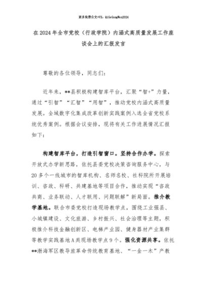 【七哥公文】2024年:在2024年全市党校(行政学院)内涵式高质量发展工作座谈会上的汇报发言+更多免费公文+VX:QiGeGongWen2024