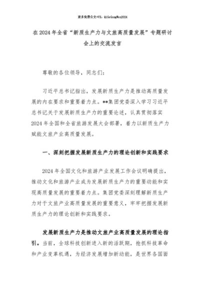 【七哥公文】2024年:在2024年全省“新质生产力与文旅高质量发展”专题研讨会上的交流发言+更多免费公文+VX:QiGeGongWen2024