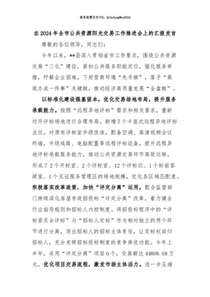 【七哥公文】2024年:在2024年全市公共资源阳光交易工作推进会上的汇报发言+更多免费公文+VX:QiGeGongWen2024