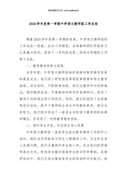 / 【七哥公文】2024年:2024学年度第一学期中学语文教研组工作总结+更多免费公文+VX:QiGeGongWen2024