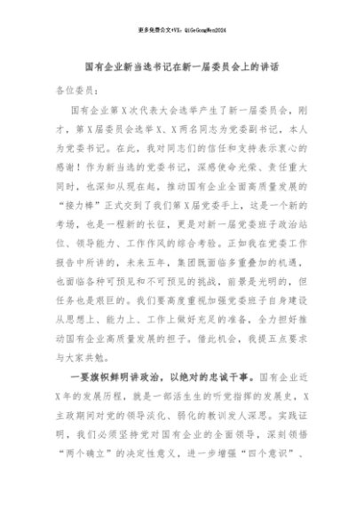 / 【七哥公文】2024年:国有企业新当选书记在新一届委员会上的讲话+更多免费公文+VX:QiGeGongWen2024