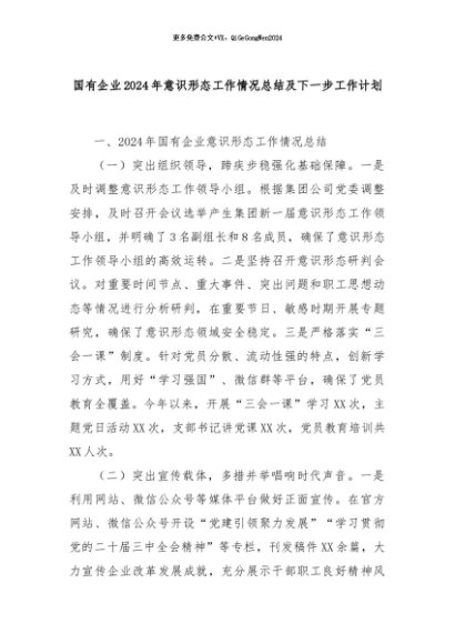 【七哥公文】2024年:国有企业2024年意识形态工作情况总结及下一步工作计划+更多免费公文+VX:QiGeGongWen2024