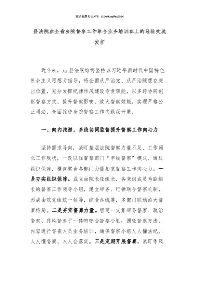 【七哥公文】2024年:县法院在全省法院督察工作综合业务培训班上的经验交流发言+更多免费公文+VX:QiGeGongWen2024