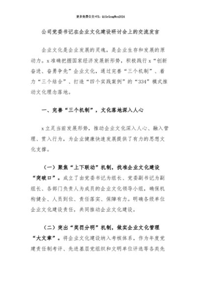 / 【七哥公文】2024年:公司党委书记在企业文化建设研讨会上的交流发言+更多免费公文+VX:QiGeGongWen2024