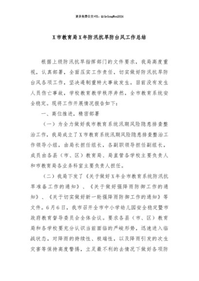 / 【七哥公文】2024年:X市教育局X年防汛抗旱防台风工作总结+更多免费公文+VX:QiGeGongWen2024