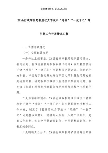 【七哥公文】2024年:XX县行政审批局基层权责下放中“甩锅”“一放了之”等问题工作开展情况汇报+更多免费公文+VX:QiGeGongWen2024